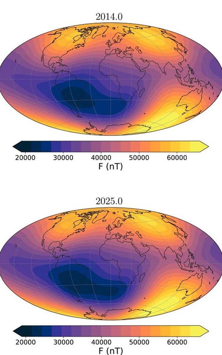 Güney Yarımküre’de, Afrika’nın altındaki zayıf manyetik alanlar batıya doğru hareket ederken, Atlantik’in ortasındaki benzer bölgeler doğuya doğru hareket ediyor.